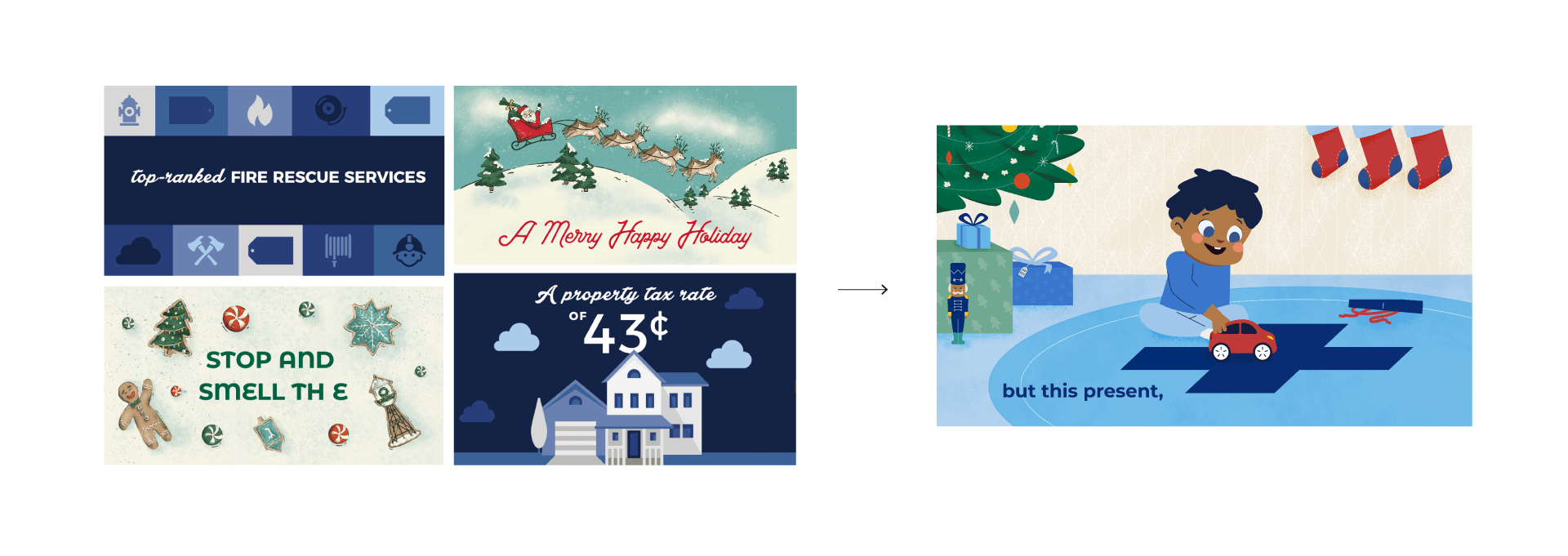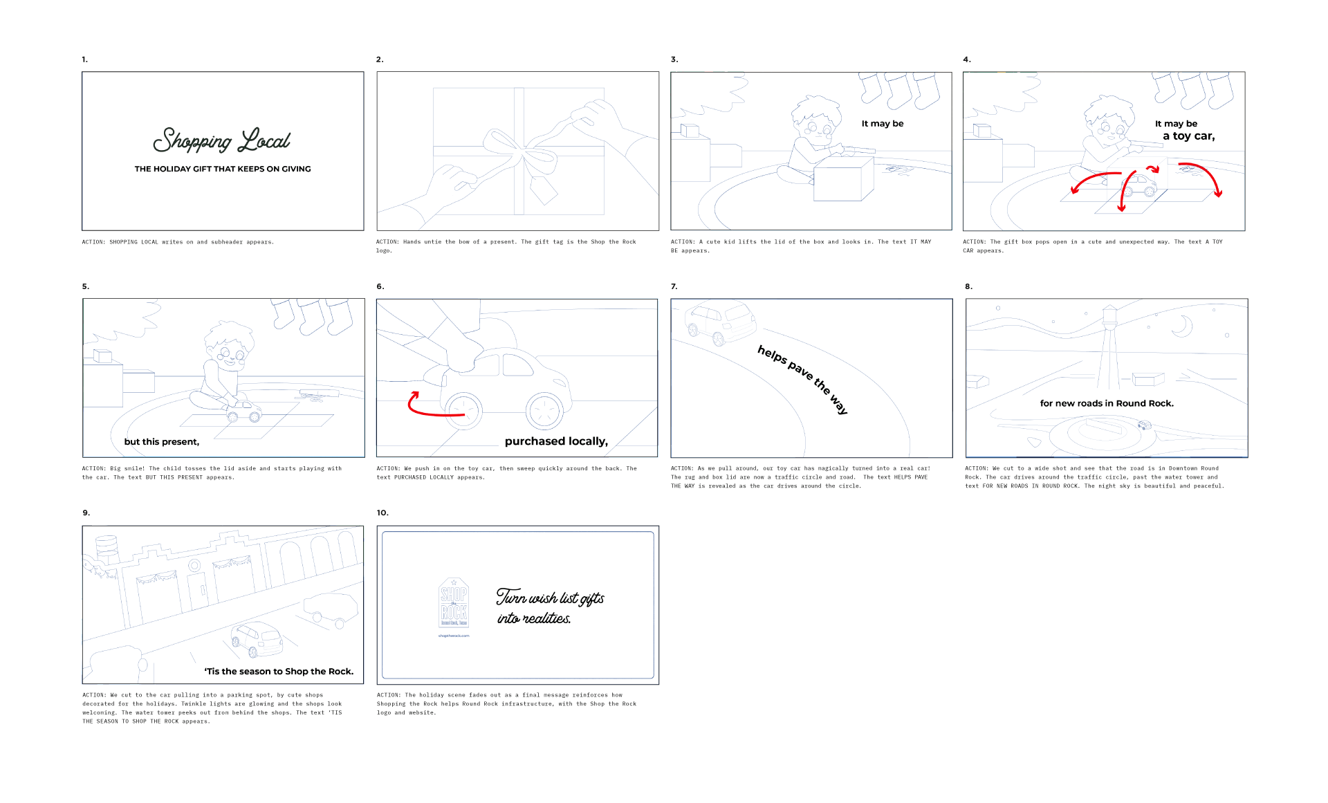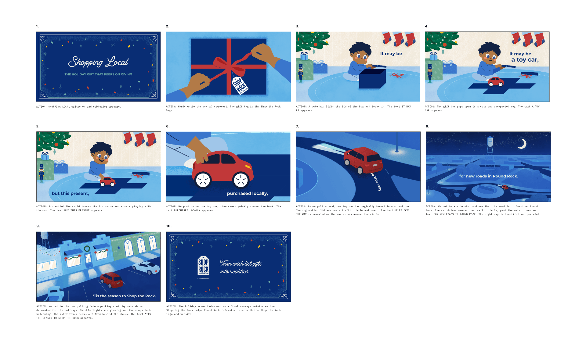 Storyboards were fully illustrated. Simple, clean shapes formed the base of the design, and texture was layered on for shading, highlights, and some lineart. Colors leaned heavily into Round Rock’s brand blues and red, with a secondary palette of greens and creams. For typefaces, I used their brand sans serif and holiday sub-brand monoline script.